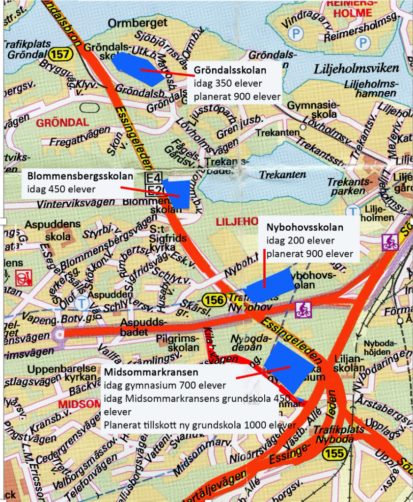 Idén att lägga ytterligare en skolbyggnad mitt i den värsta trafikkarusellen i södra Stockholm är helt befängd! Det skriver Elisabeth Edsjö för BUMS i en skrivelse till Stockholms stad. Platsen där man vill bygga en ny grundskola för 1000 elever är omringad av Essingeleden, Södertäljevägen, Hägerstensvägen och Tellusborgsvägen… Av kartan här framgår också att staden planerar ytterligare utbyggnad av skolor i trafikstörda lägen.